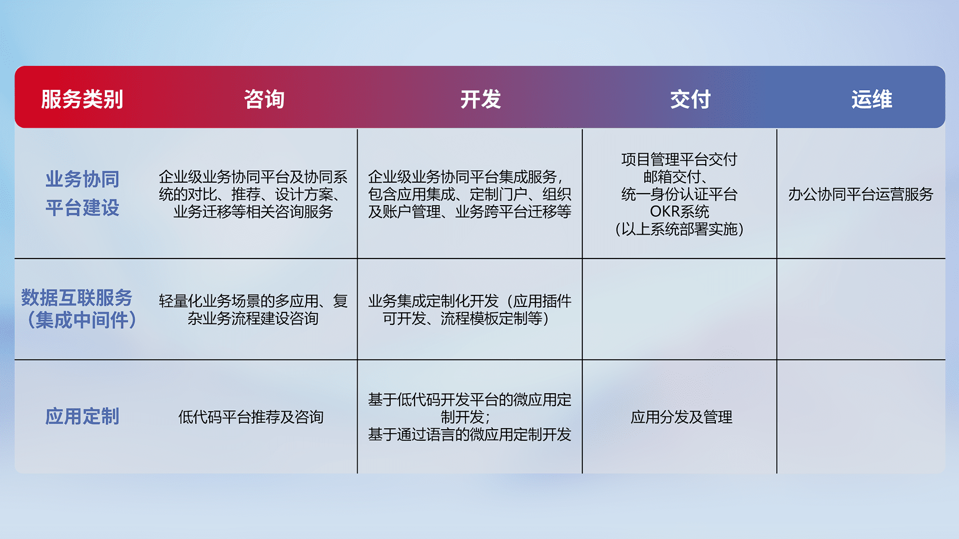 针对钉钉、、、企微、、、、IDaas等平台级产品提供产品的规划、、、、方案、、交付、、、、定制化开发等服务,,,,实现如统一协同办公、、、、智能客户服务、、混合会议管理、、智能数据查询、、、等业务场景,,,实现数字化转型。。。